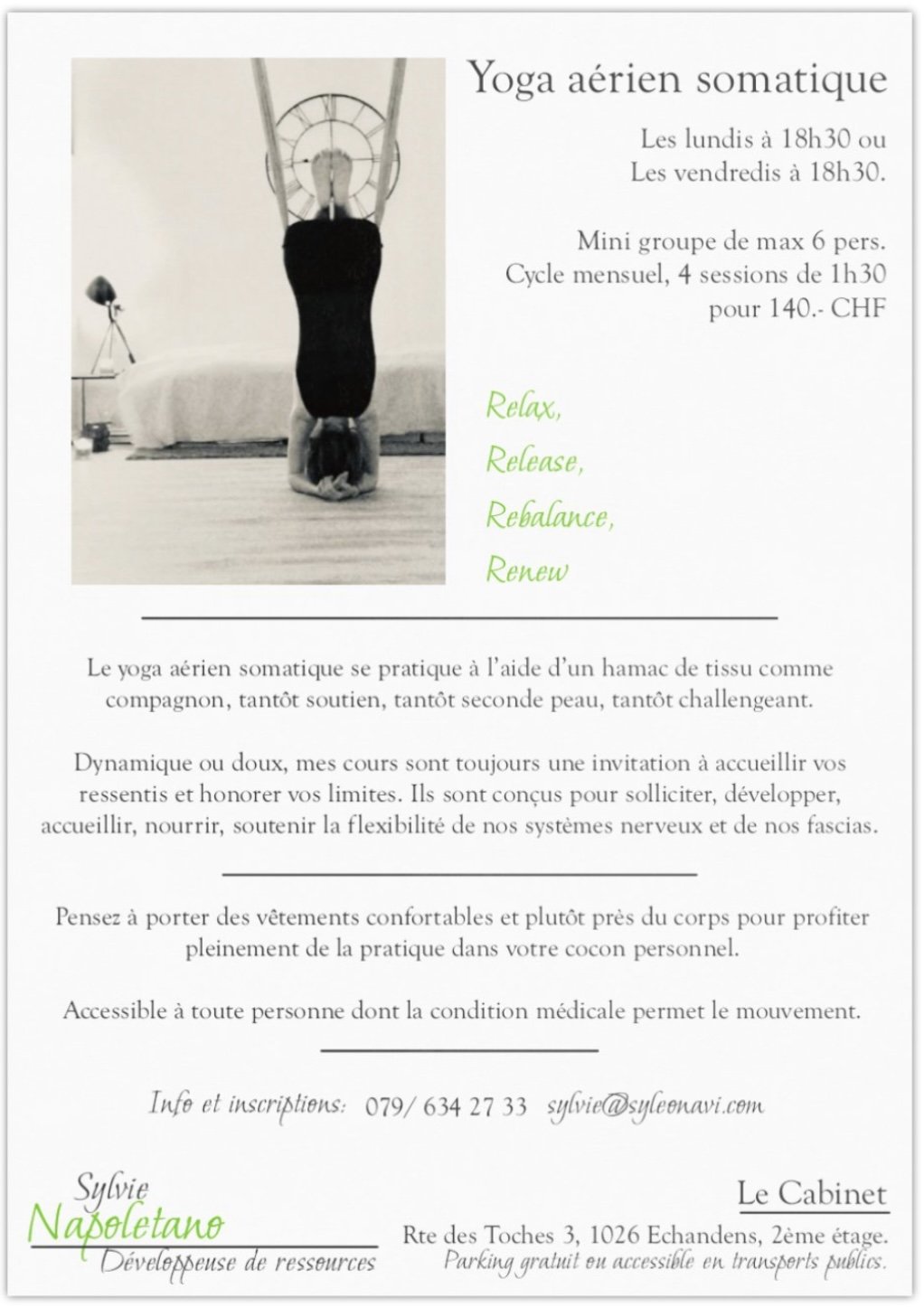 Le yoga aérien somatique se pratique à l aide d un hamac de tissu comme compagnon, tantôt soutien, tantôt seconde peau, tantôt challengeant. Il est accessible à toute personne dont la condition médicale permet le mouvement. C’ est une pratique qui combine des références de danse, de cirque et bien sur de yoga.